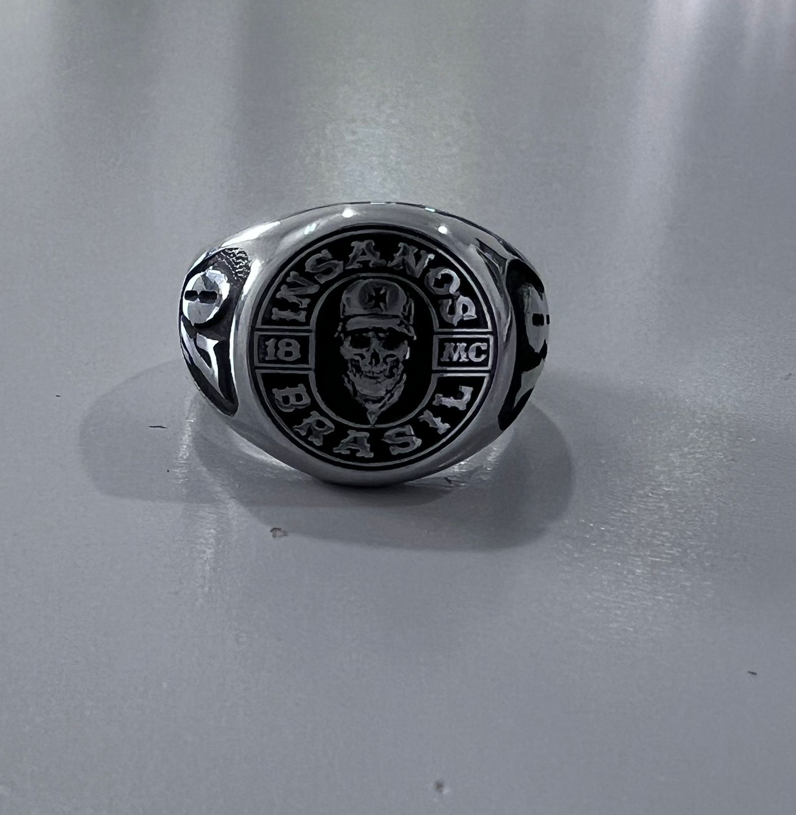 Este anel imponente é uma homenagem à força e à história do Insanos MC, fabricado com aço cirúrgico de alta qualidade, garantindo resistência e durabilidade. No centro do anel, destaca-se o brasão oficial do clube, representando a união, a lealdade e o espírito inquebrantável dos membros. No lado direito, está gravada a sigla "OZ", um tributo ao início da jornada do clube, simbolizando as raízes profundas e a origem de sua irmandade. À esquerda, o número "18" faz referência à Revolta dos 18 do Forte de Copacabana, um evento marcante da história militar brasileira, que carrega em si a resistência e a luta pela liberdade. Este anel é uma peça exclusiva, feita para quem tem orgulho de sua história e identidade, e deseja mostrar sua força e respeito pela irmandade.