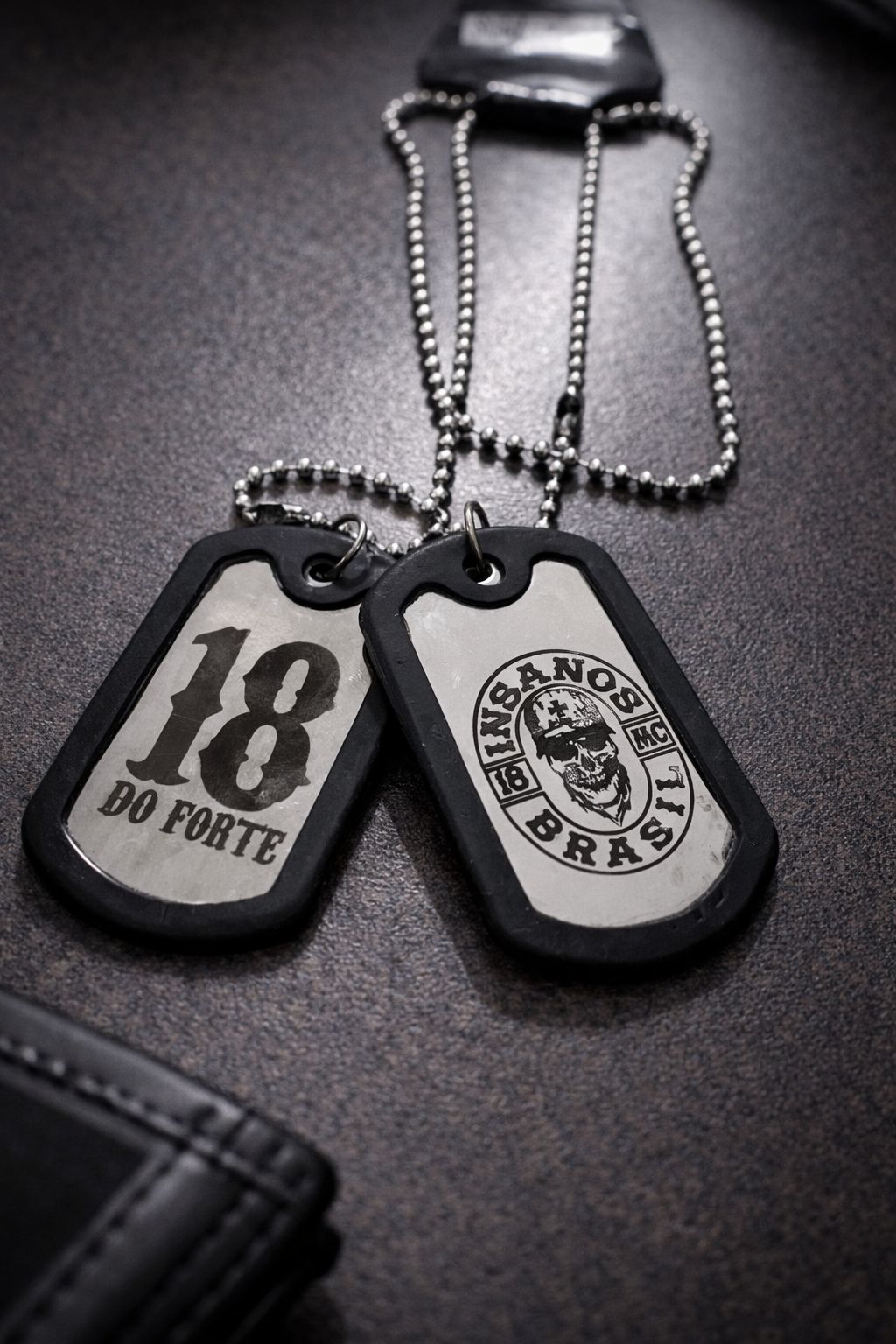 Produzido em metal resistente, acompanha duas plaquetas com gravações exclusivas: de um lado o brasão Insanos Brasil MC e do outro uma arte simbólica que representa lealdade, irmandade e respeito às regras.