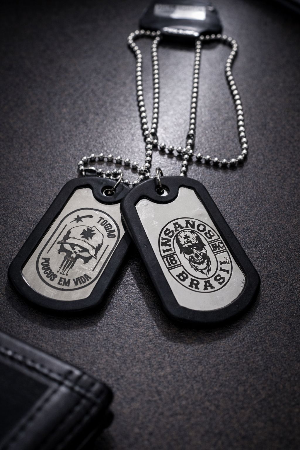 Colar estilo dog tag militar, com acabamento robusto e visual marcante, ideal para quem carrega o espírito do Insanos MC no dia a dia.
